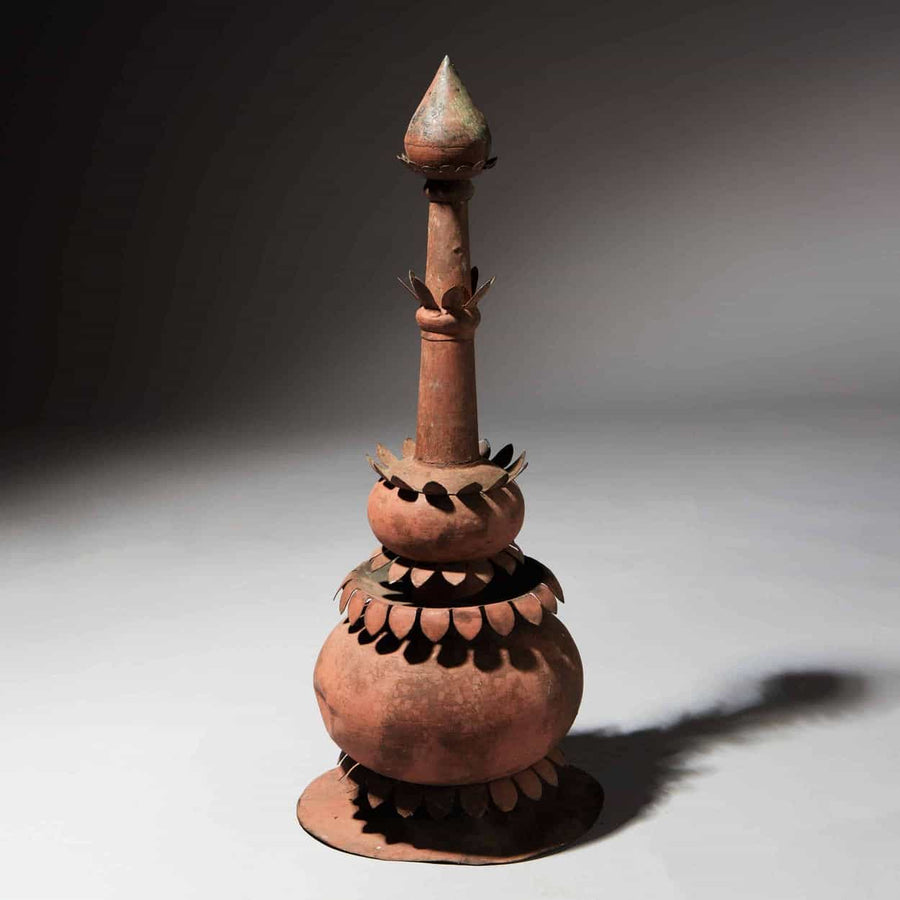 An unusual and highly decorative Indian tole architectural finial painted a rust hue with touches of green over painting, inspired by a flower bud, a spike rises high above the base with stylised leaves and petals around two graduated spheroids, the whole on a flat oval base.
