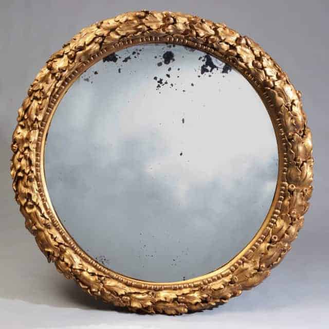 A 19th-century gilt and carved convex mirror of colossal proportions. The gilt frame carved with oak leaves and acorns in abundance, and retaining its original slightly convex mirror plate.