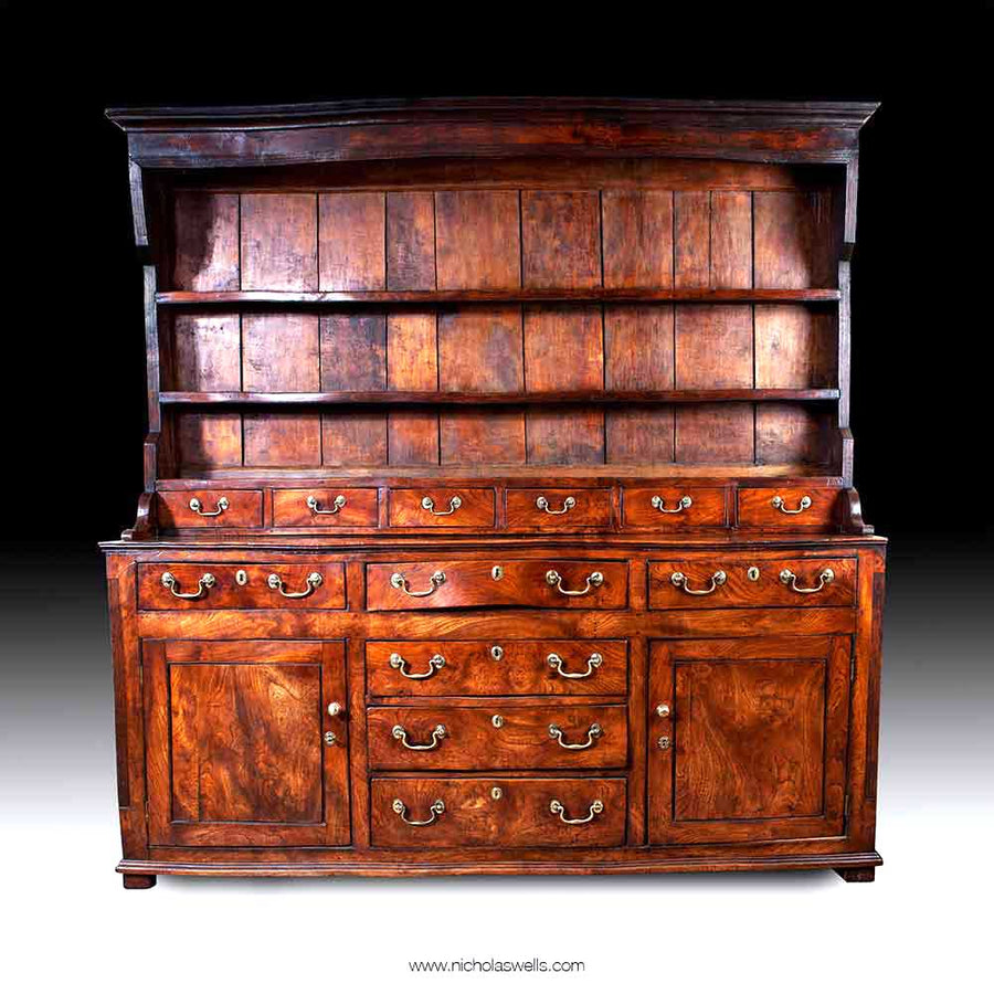 A fine elm North Welsh Dresser with shaped panels to the base, and fine detailing to the fascia board and sides of the rack, the dresser has very fine patterning to the grain, wonderful deep rich colour and excellent patina. The base has two cupboards either side of a bank of central drawers, with three drawers above. Six further drawers located in the base of the upper shelves.