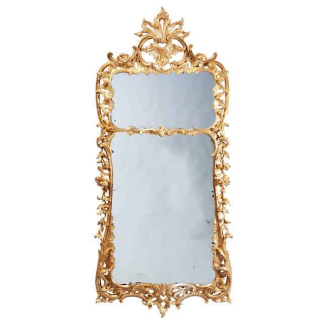 A fine large scale George II Chippendale period giltwood pier mirror, the carved and pierced wooden frame with rococo ornament and water gilding.