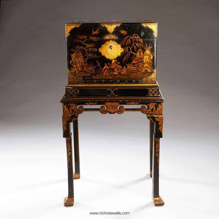 A fine 19th century Japanned lacquer cabinet decorated in black with gilt village scenes, the corners with gilt metal mounts matching the lock plate, opening to a lacquered interior with quails on the inside lid, now raised on a 19th-century black lacquer stand decorated to match.