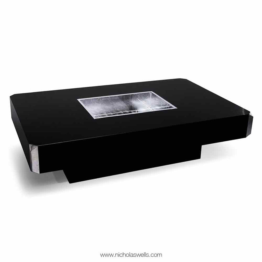 Black lacquer with polished steel angled corners and an inset steel basin, resting above a recessed plinth.