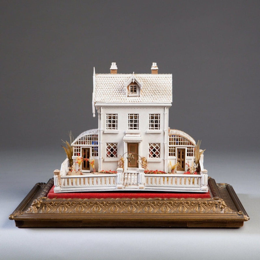 An Edwardian white painted wooden model of an idealised cottage with cut velvet flowers in the gardens and flanking conservatories.