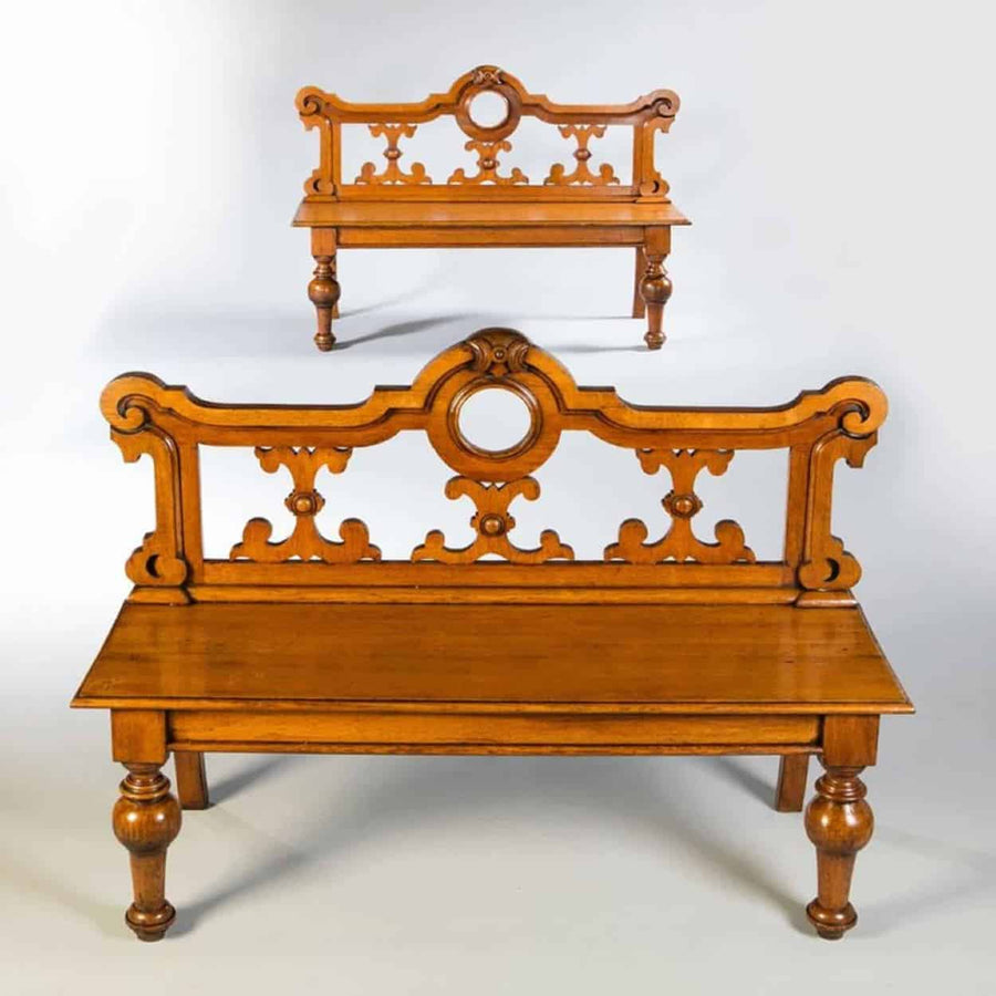 A pair of mid 19th century oak neo renaissance hall benches in the manner of Anthony Salvin.