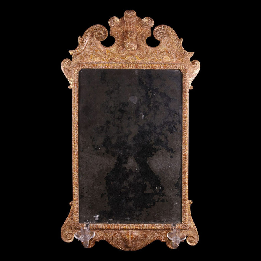 A rare Queen Anne gilt gesso pier mirror, retaining its original beveled mirror plate and gilding. The cresting bears the unusual feature of a carved bust in high relief below three feathers. In the manner of John Belchier.
