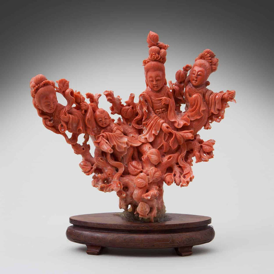 A fine early 20th century carved pink coral figurative group amongst foliage.