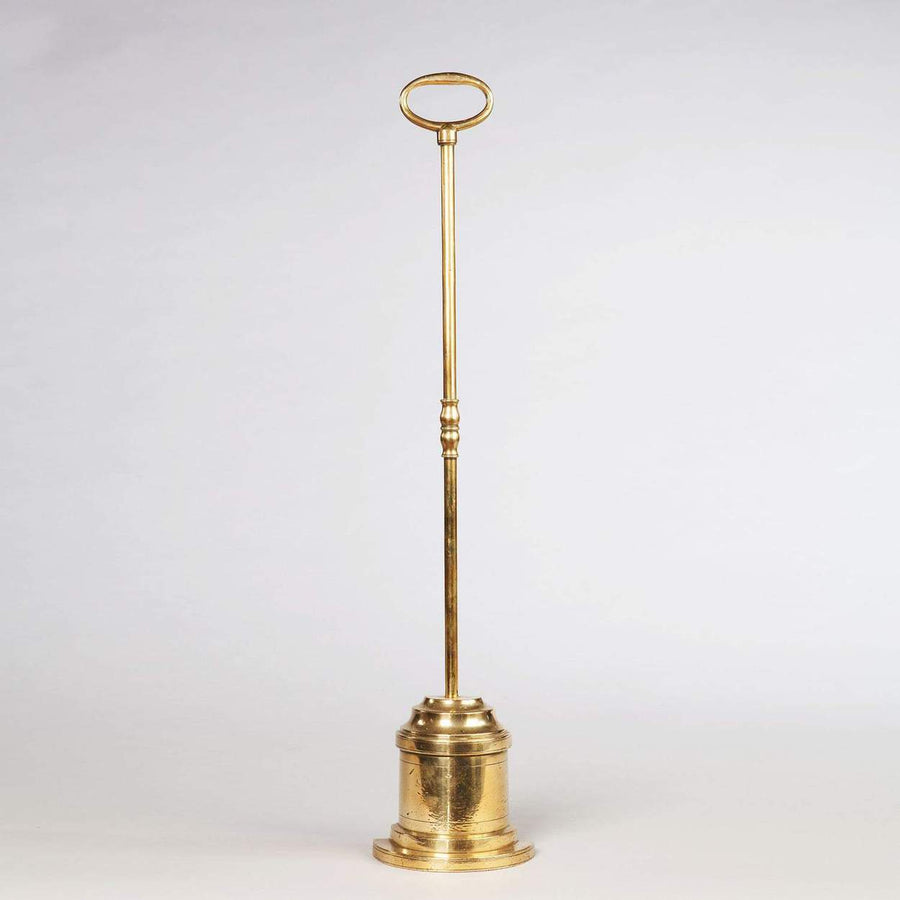 A Regency overscale Tall brass dado rail height door stop. The tall brass stem has an oval ring handle above a half bell shaped base - weighted with lead.