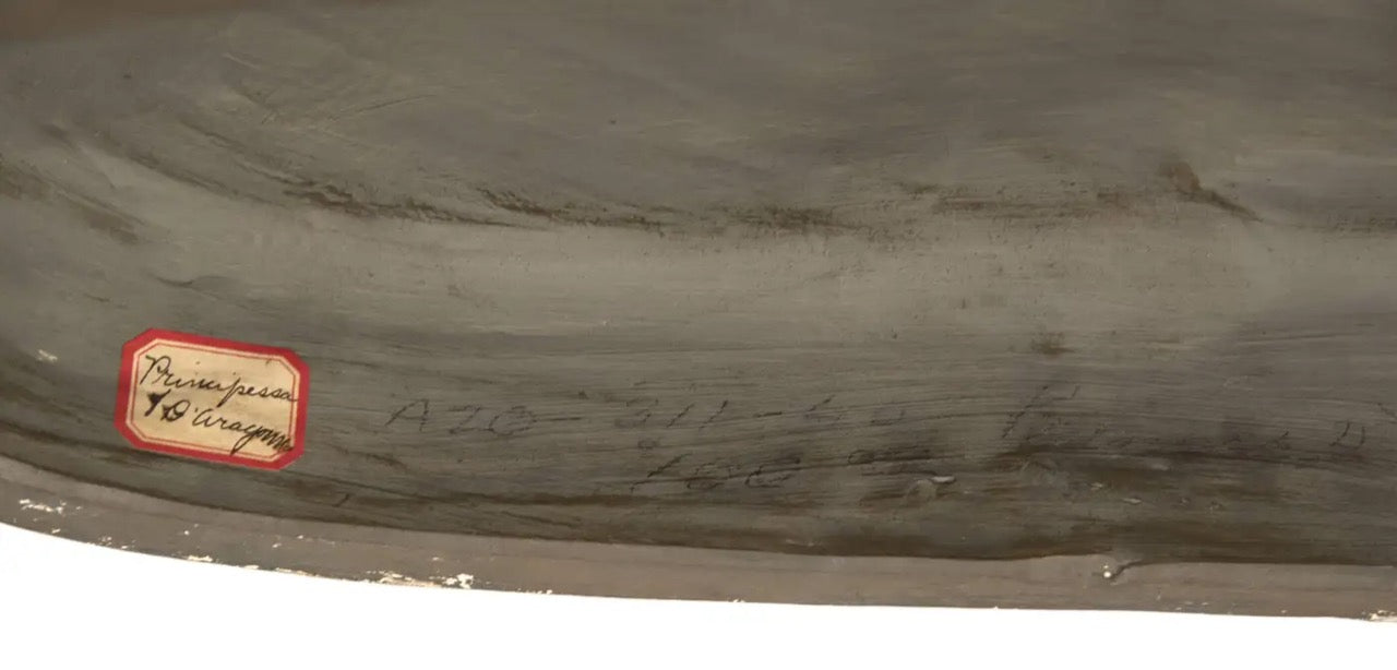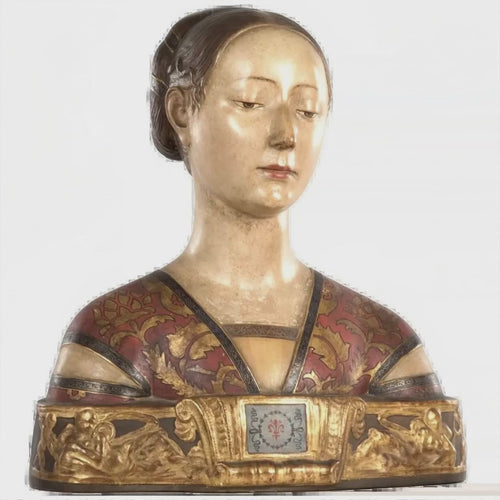 This bust — exquisitely hand-painted and gilded in terracotta — preserves the quiet dignity and aristocratic grace of Laurana’s original. Its decorative base, featuring reclining classical figures and winged cupids, is characteristic of the sculptor’s elegant fusion of humanist ideals and courtly splendour. A superb collector’s piece, it stands at the intersection of Renaissance history and 19th-century craftsmanship.