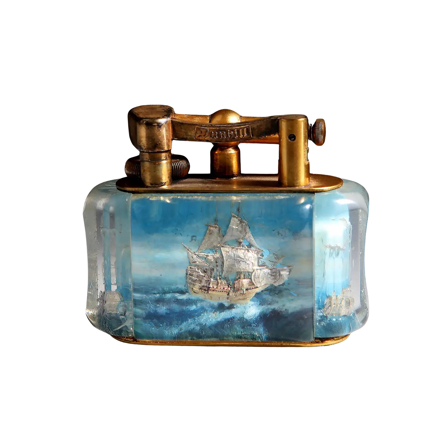 A distinguished Dunhill Aquarium Ship Lighter, this rare work of art from mid-century England captures the essence of maritime history with exceptional finesse. Dating to circa 1955, the piece exemplifies the unique artistry and technical prowess of the Dunhill brand, celebrated for exquisite vintage metal lighters crafted with British precision.