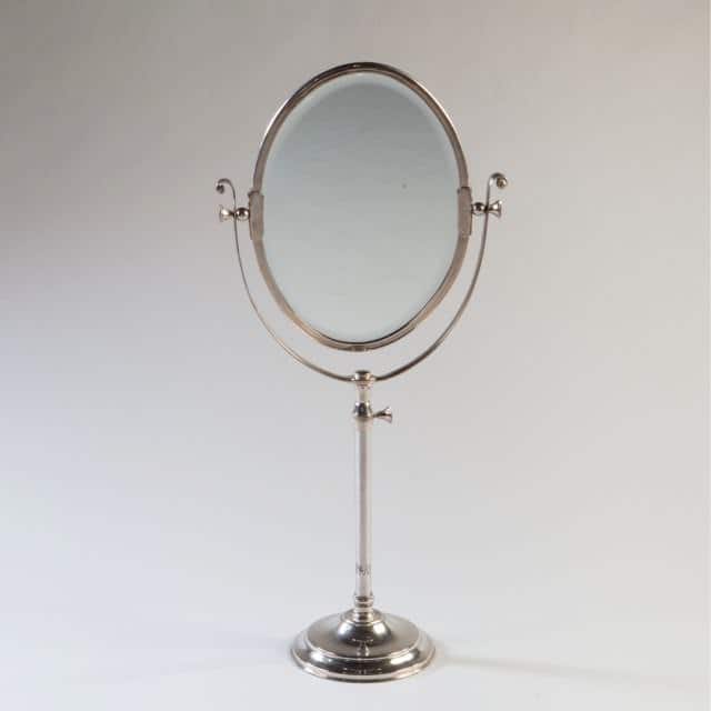 An Edwardian overscale oval silver plate dressing mirror of adjustable height and mirror angle.