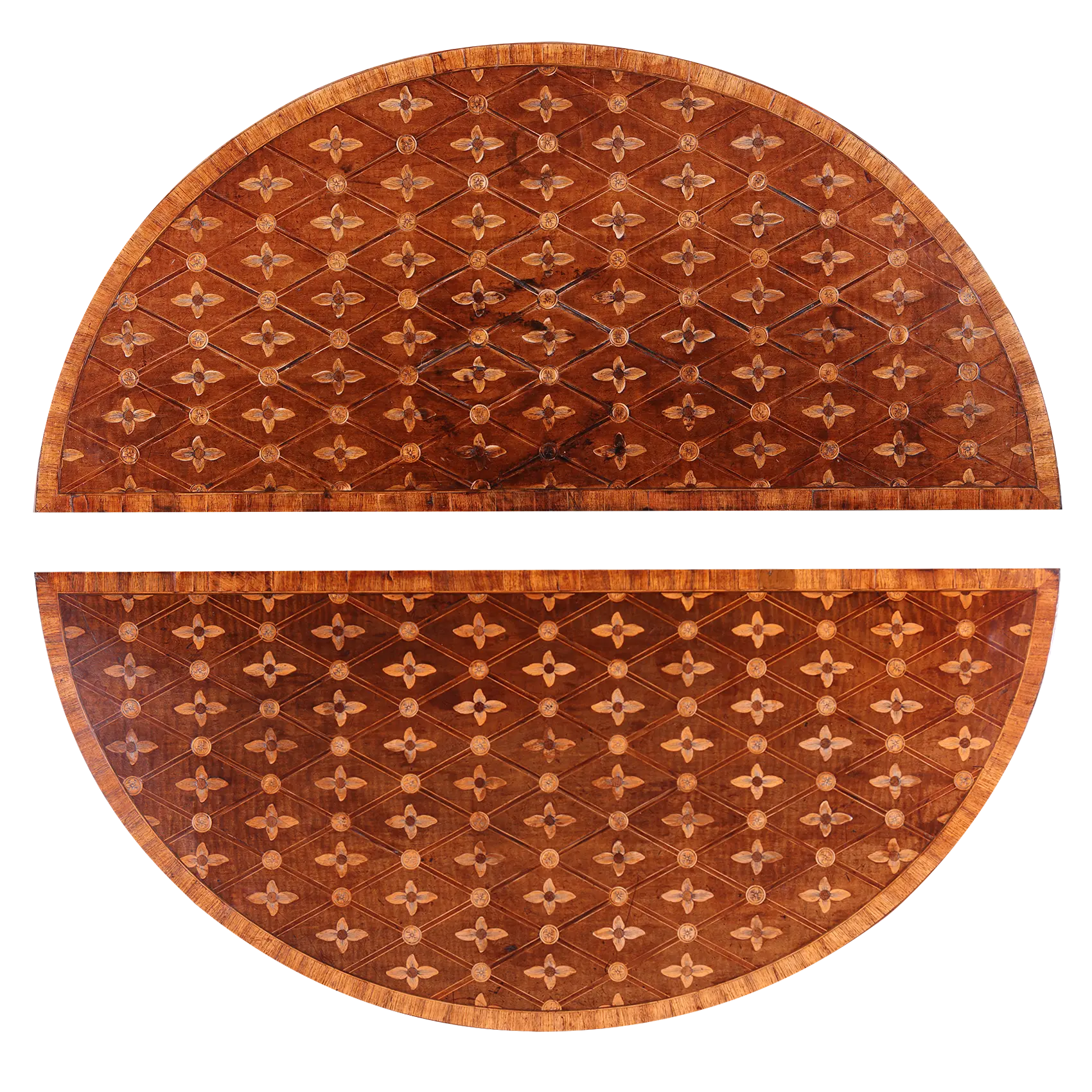 Small Pair of Demi Lune Card Tables Attributed to John Linnell with intricate parquetry and inlaid mahogany details.
