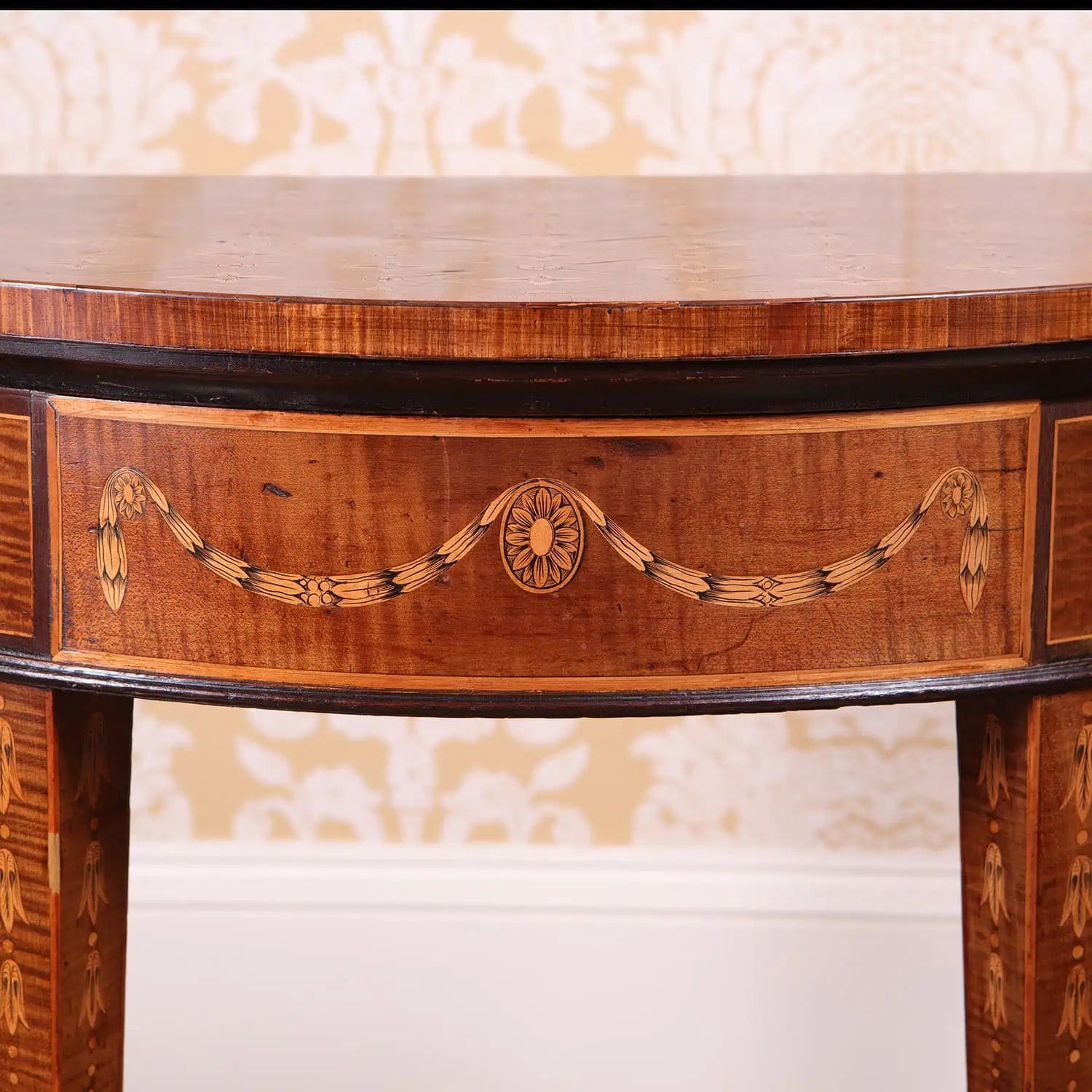 These demi lune card tables are highly prized for their scarcity and desirable small scale, making them especially sought after by collectors of George III antiques. Their attribution to Linnell and superlative decorative inlay further enhance their collecting value. Perfect as statement pieces in a refined interior, they offer practical versatility—equally suited for display in a drawing room, as functional card tables, or as sophisticated console tables anchoring an entryway.