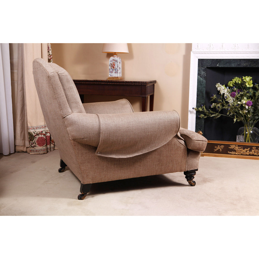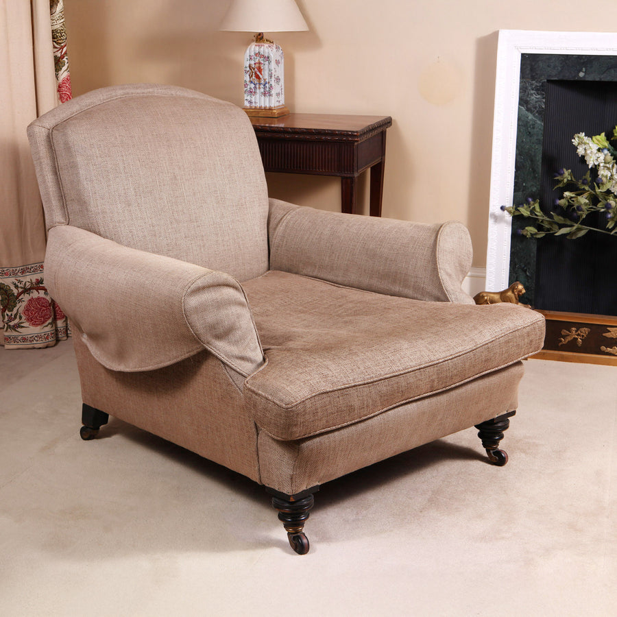 A very large scale Howard style armchair, retaining its original casters and carved and turned mahogany legs.
