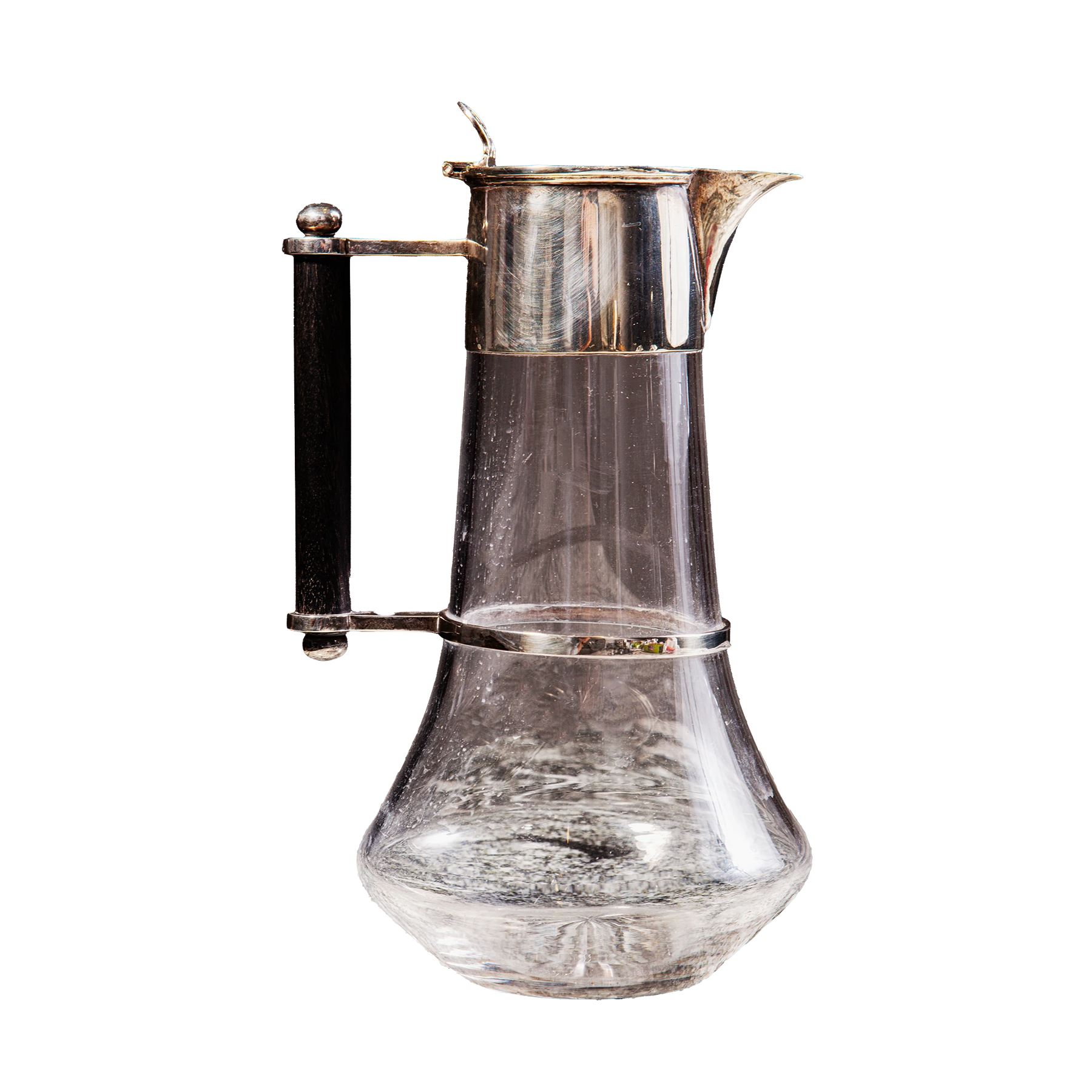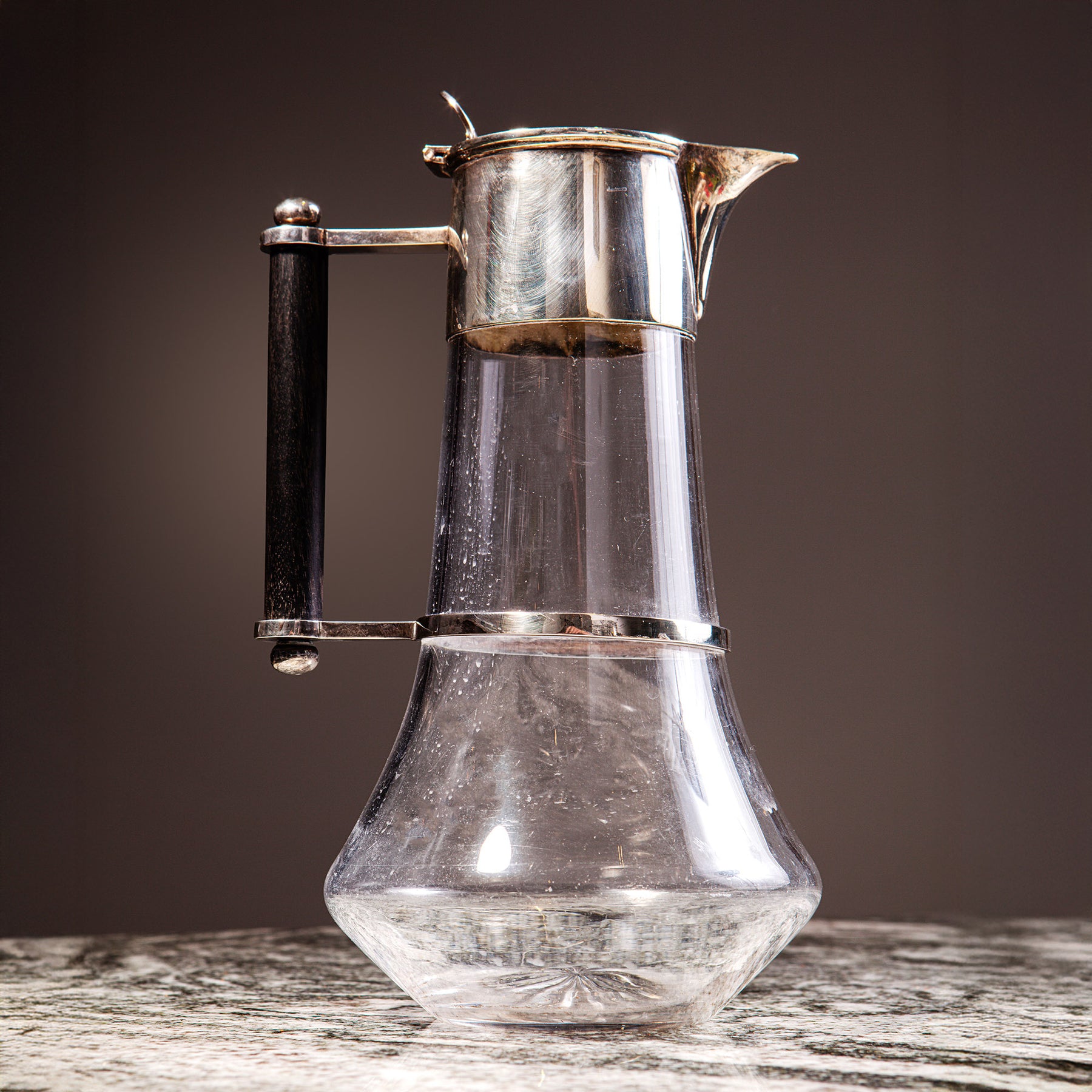 This glass and silver plated claret jug with a gently flared, pear-shaped glass body that tapers upward into a narrower neck. The top section—including the hinged lid, spout, and a banding collar—is made of silver plate, the ebonised handle is mounted between two silver end-caps.