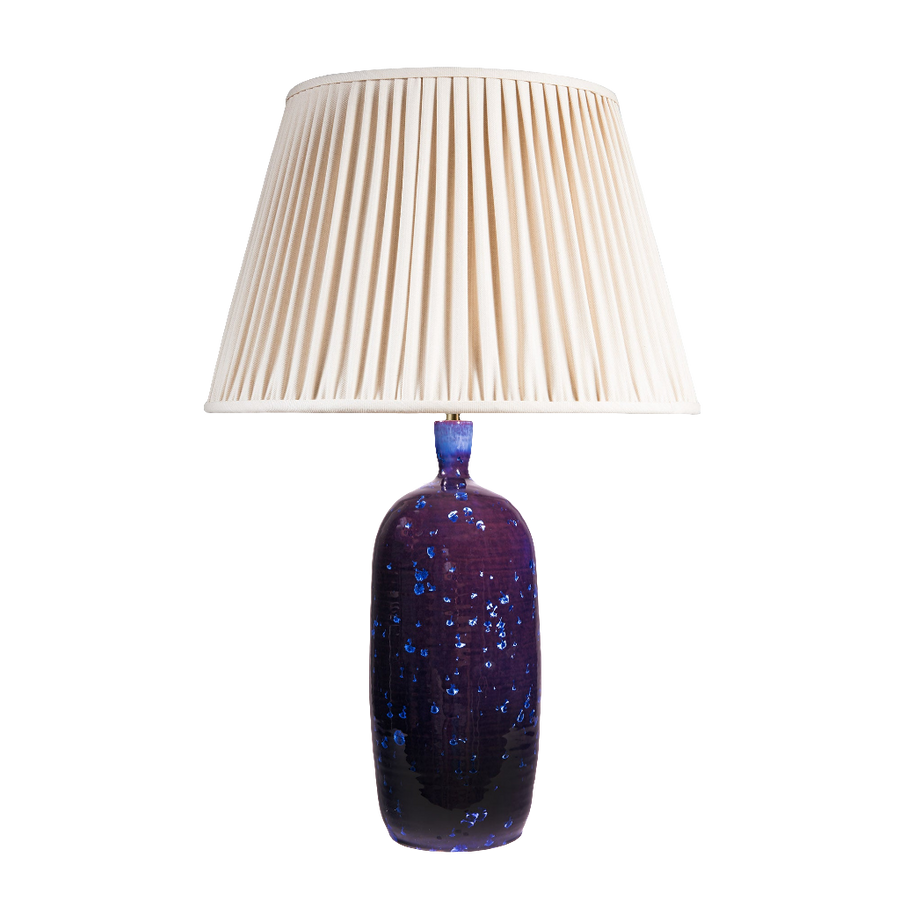 This striking porcelain vase, now mounted as a table lamp, features a deep purple ground flecked with vivid sapphire-blue crystalline inclusions. The crystalline glaze creates a unique, almost celestial effect — each crystal formation catching the light with subtle brilliance. The smooth, elongated body and narrow neck give the piece a refined silhouette, allowing the surface decoration to take centre stage.