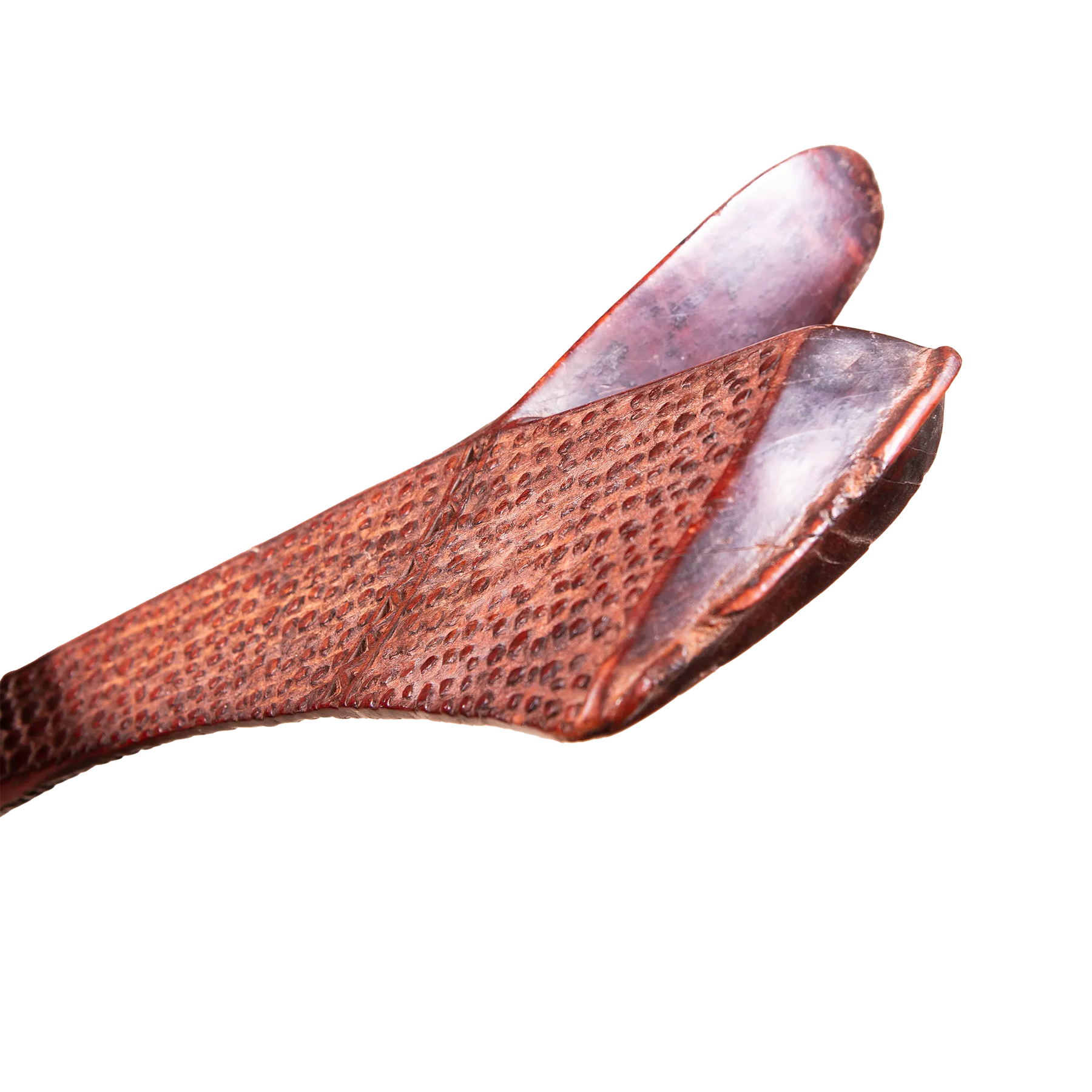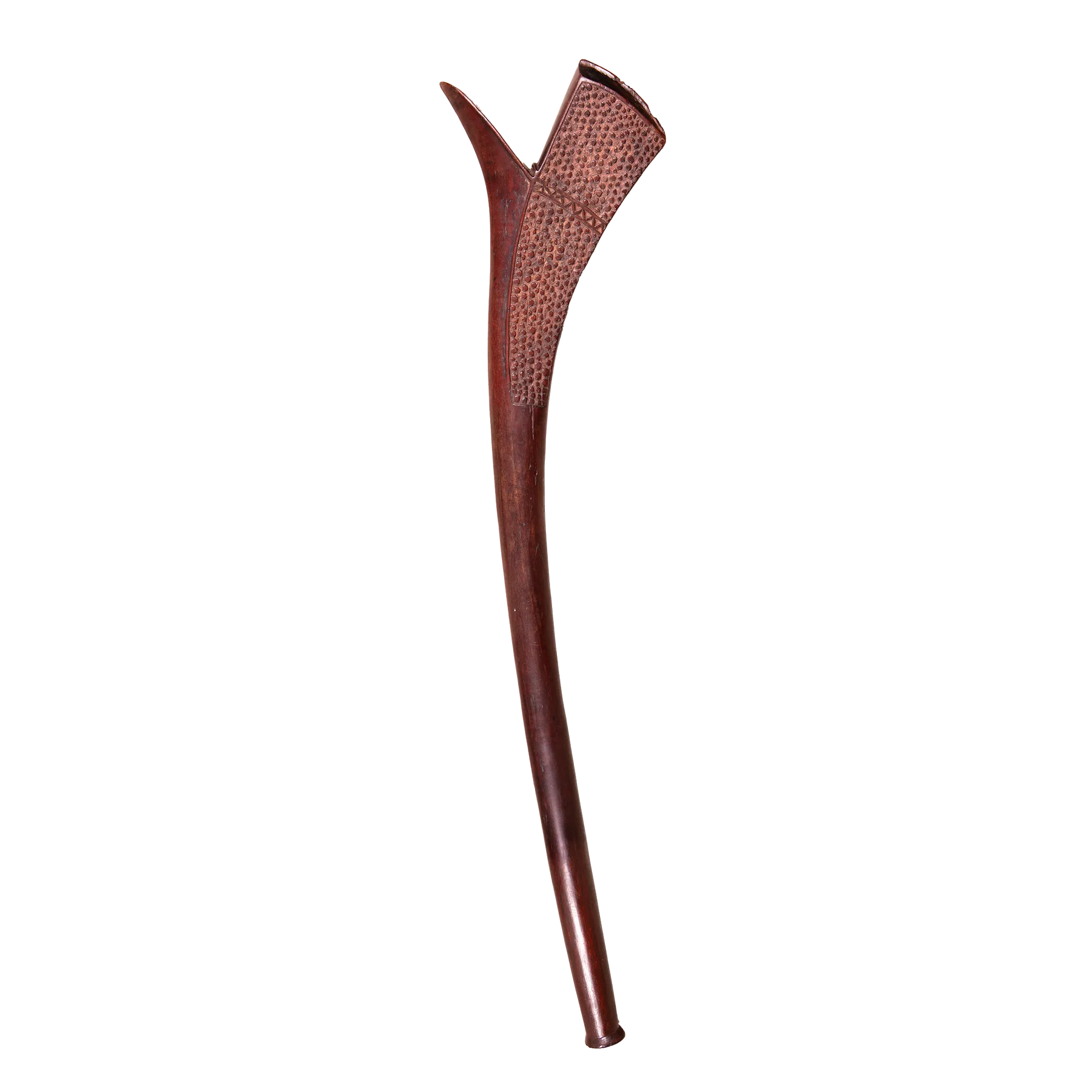 Carved from dense hardwood, this striking Fijian Gata war club (also known as gata waka) exemplifies the artistry and symbolic power of Polynesian weaponry. The term gata means snake in the Fijian language, a reference to the weapon’s distinctive curving, serpent-like head.