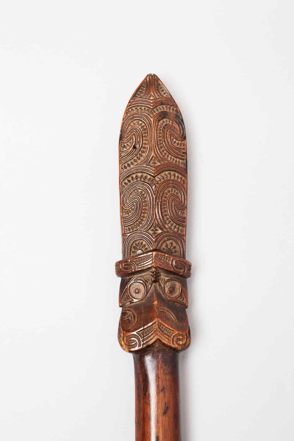 Distinguished by intricate hand-carved motifs typical of nineteenth-century Maori artistry, the shaft is adorned with spiral scrolls and stylised faces (koruru) finished to a deep, lustrous patina.