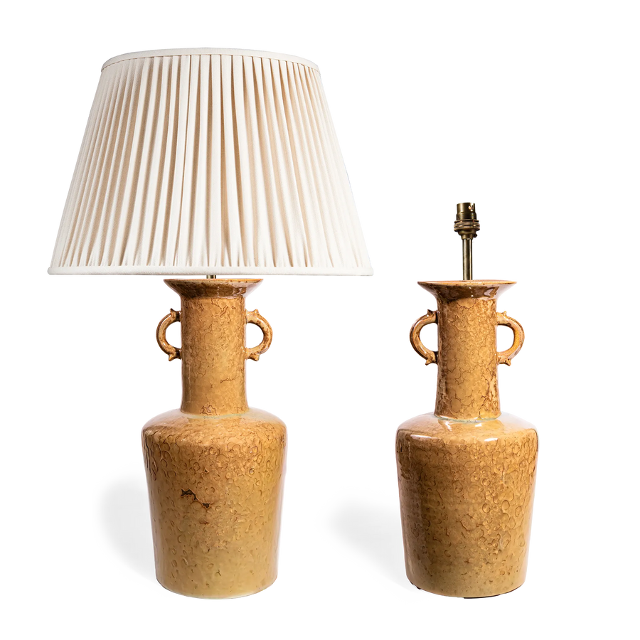 This pair of amber crystalline-glazed vases, mounted as table lamps, is a celebration of technical mastery and timeless design. Their bold cylindrical bodies, flared rims, and twin loop handles recall the authority of classical vessels while showcasing the beauty of contemporary ceramic expertise.