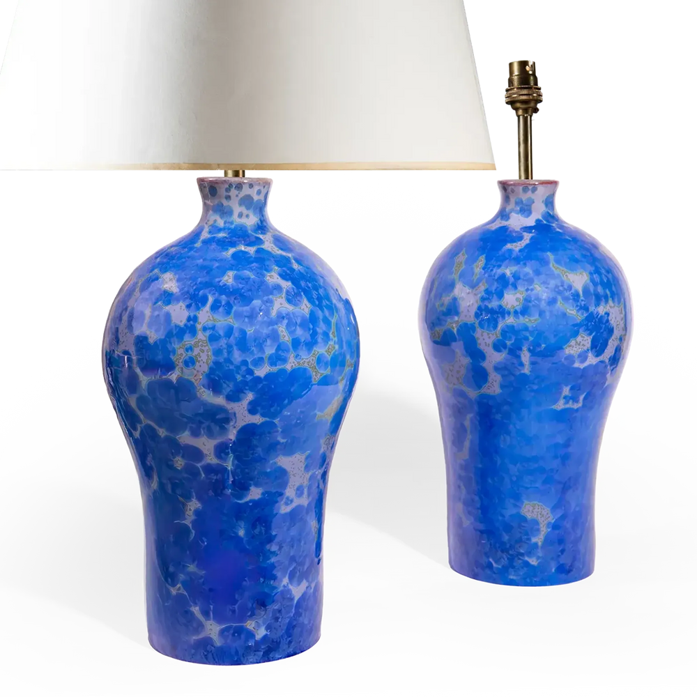 The classical baluster form is refined and timeless, while the crystalline glaze ensures that no two surfaces are ever alike, giving each lamp its own unique character. These lamps bring a bold pop of colour and artistry to both contemporary and traditional interiors.