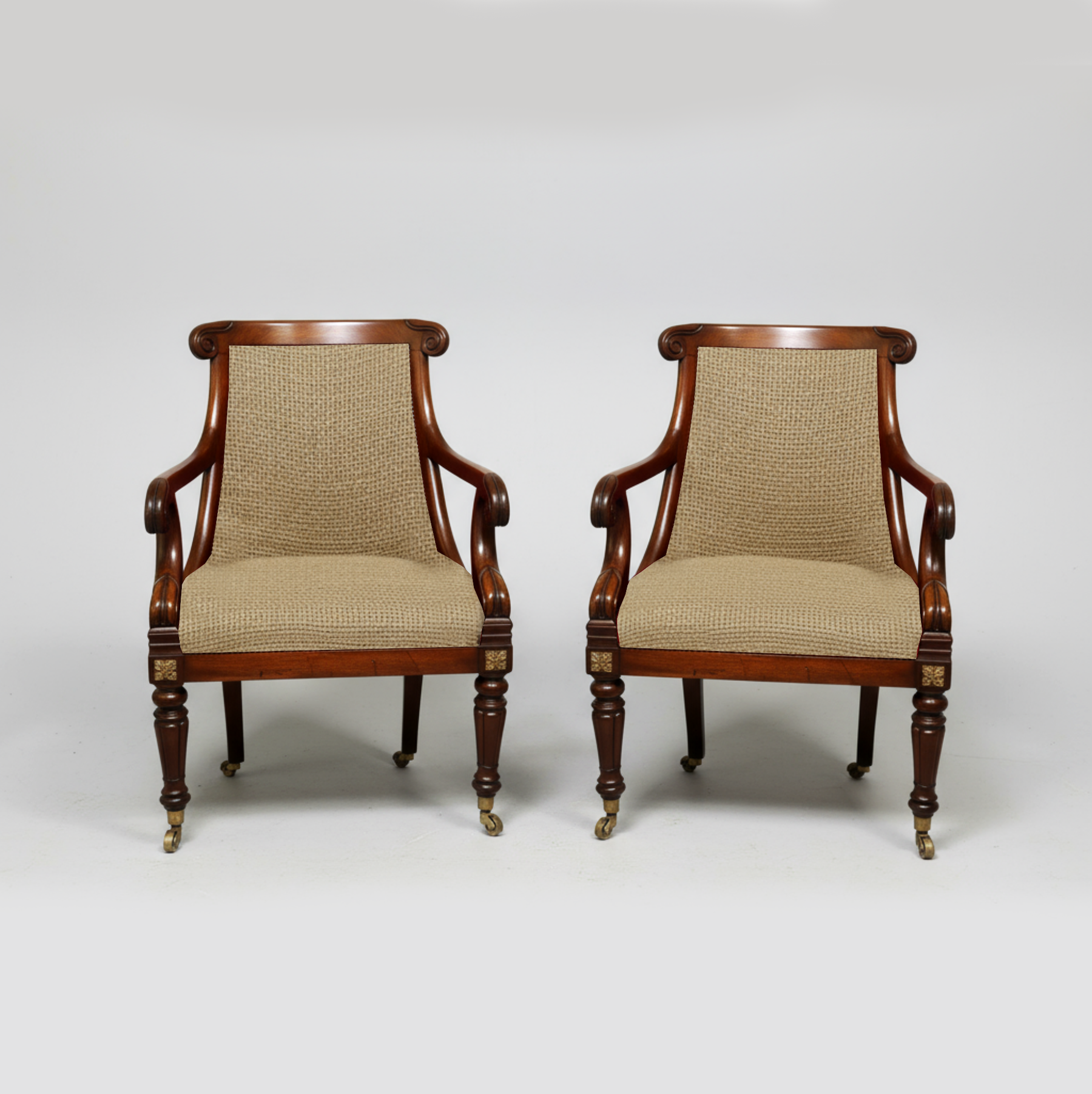 A pair of Regency period bergère armchairs, designed as library chairs with solid mahogany frames. Each features a shaped crest rail, scroll arms, and removable seat. Raised on reeded front legs and splayed rear legs, both terminating in the original brass casters. Presently upholstered to hessian. The upholstery shown is an AI suggestion.