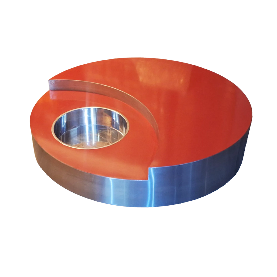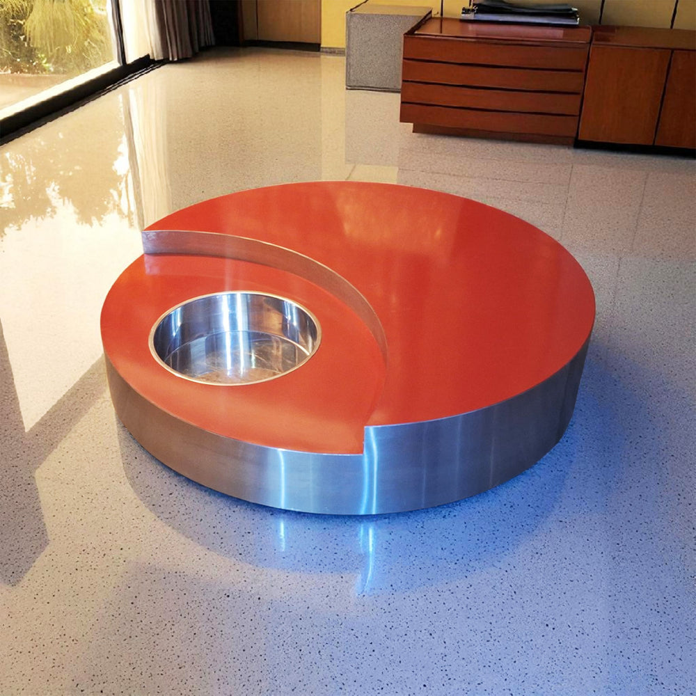 A striking example of original 1970s Italian design, this revolving coffee table by Willy Rizzo combines bold geometry with glamorous materials. The circular form is finished in a vivid red formica, contrasted with a recessed central chrome tray and edging in brushed steel, creating the sleek, luxurious look for which Rizzo became renowned. Can also be used as a cocktail table.