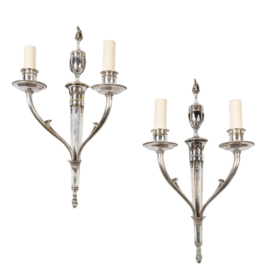 Pair of Chrome Two Branch Art Deco Wall Lights After Maison Charles