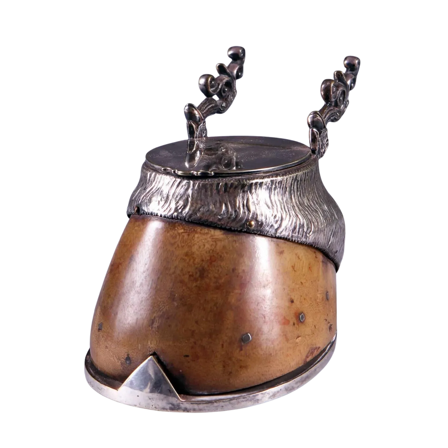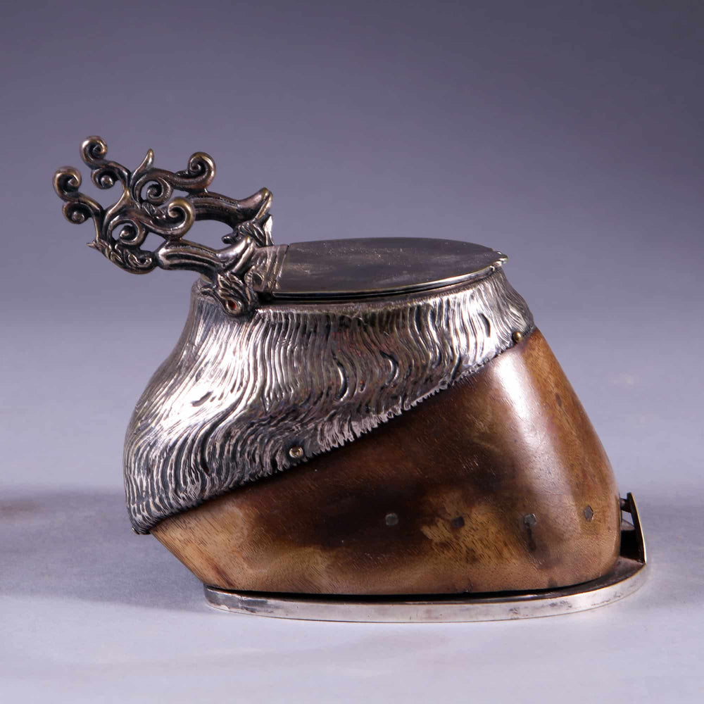 Late 19th Century Horse Hoof Inkwell with silver plated mounts and pen rest, retailed by Naturalists Piccadilly.