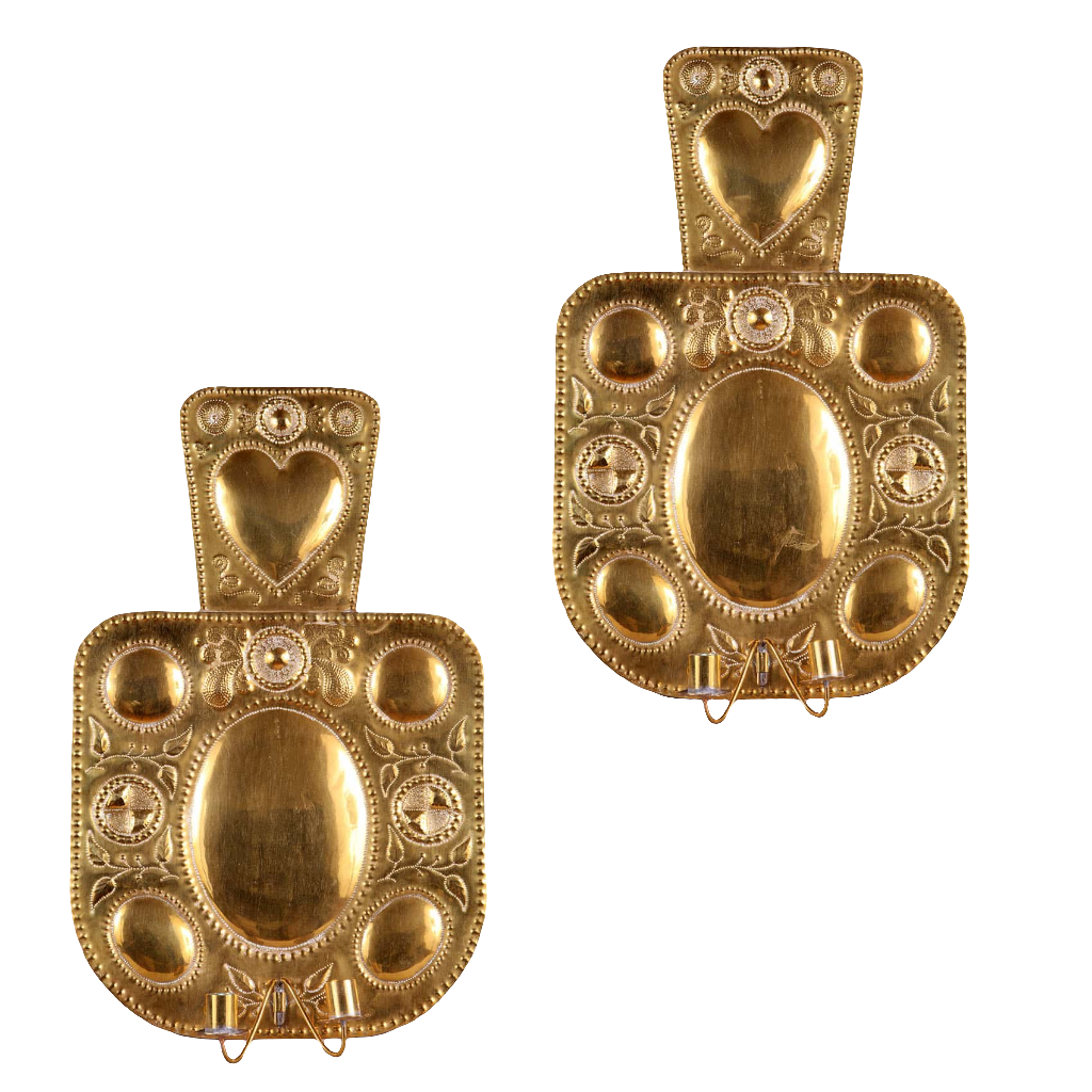 Pair of 19th century brass repousse wall lights with ornate hearts and decorations by Collection EE10, Netherlands circa 1880
