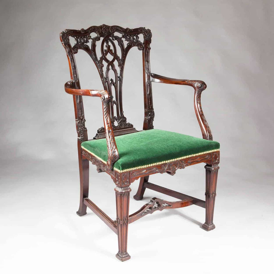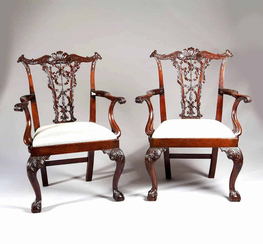Chippendale’s furniture combined exceptional technical skill with a unique ability to interpret and blend stylistic movements of his era. His designs gracefully balanced the exuberance of the Rococo, the symmetry and order of Neoclassicism, and the fascination for the exotic then sweeping Europe, particularly the taste for chinoiserie. His work was instantly recognisable for its elegant proportions, sinuous lines, and lavishly carved details—ribbons, scrolls, acanthus leaves, and fretwork—executed in the finest materials, from rich mahogany to satinwood and rosewood.