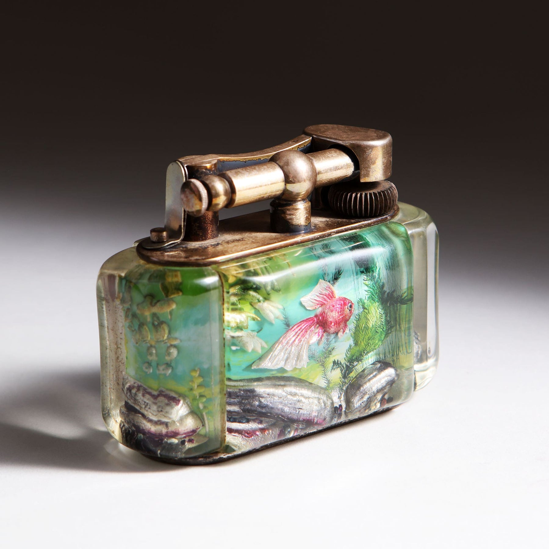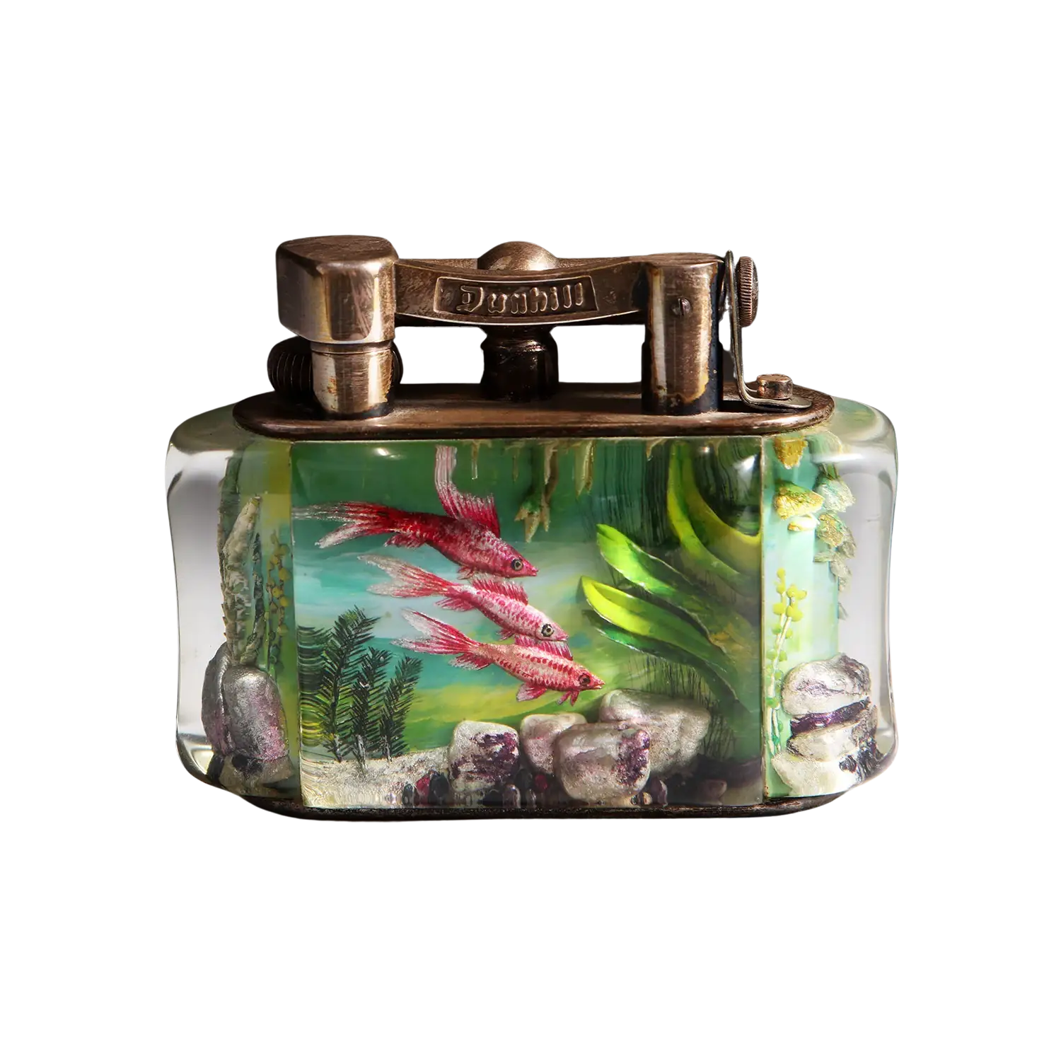 The Dunhill Aquarium Table Lighter stands as a testament to Mid-Century creativity, its softly rounded lines and harmonious proportions referencing both Art Deco and emerging contemporary styles. The distinctive use of reverse intaglio Lucite panels—each individually painted and carved—sets these lighters apart as icons of sculptural design and technical mastery.