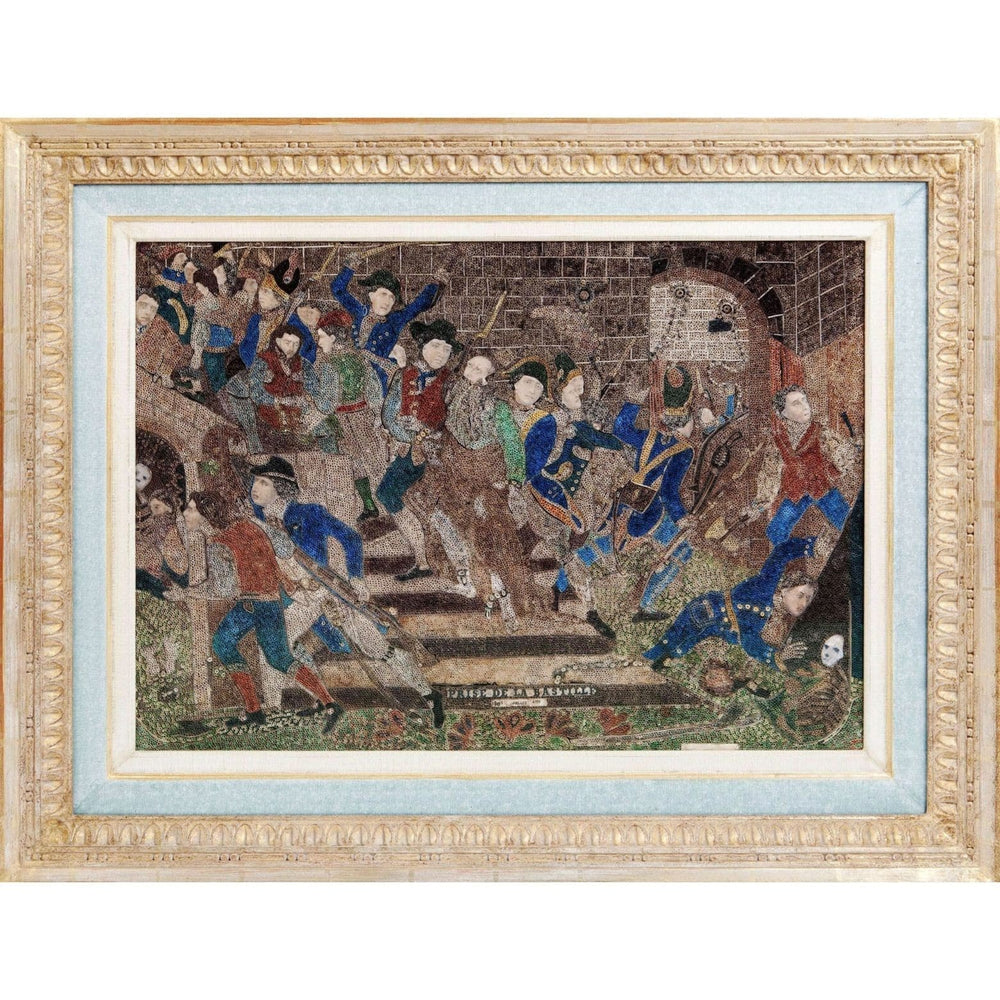 A very rare mid 19th-century picture depicting the storming the Bastille in Paris, 14 July 1789. With incredible attention to detail, the figures all picked out in multi-coloured rolls of paper measuring no more than 1.5 millimeters in diameter. Some roles picked out in gold leaf to highlight buckles, buttons, hinges, weapons, and chains. The colours and figures remain in exceptional condition