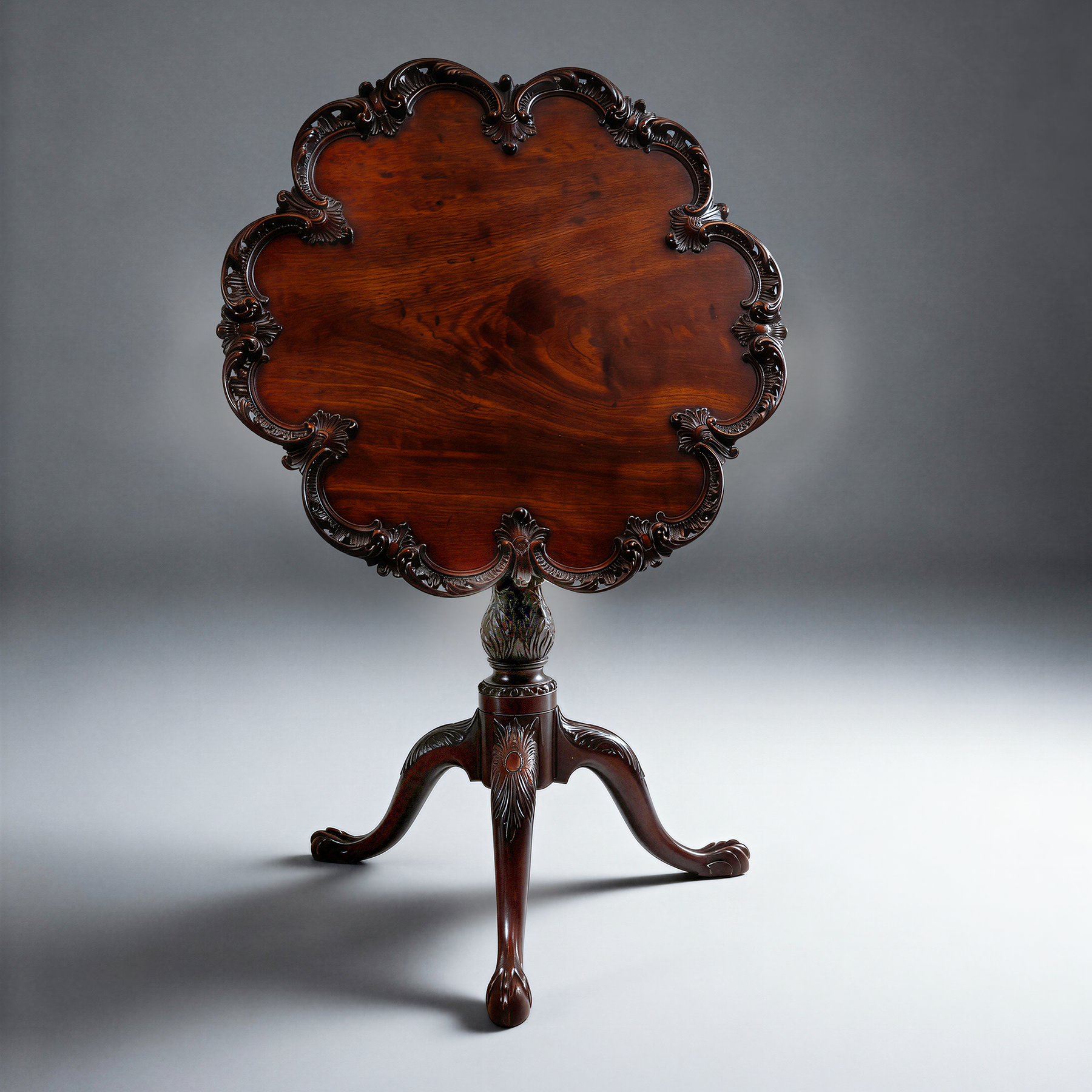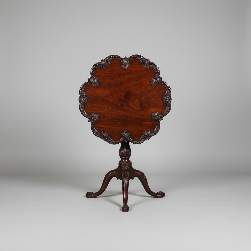 An exceptional mid 18th century pie crust tilt top tripod table. The scalloped top of exceptionally heavy figured mahogany carved with a scalloped border with acanthus details on the surface and icicles and rockeries on the under side. The whole raised on carved and detailed baluster column with bird cage closure and supported on cabriole legs terminating in claw and ball feet.